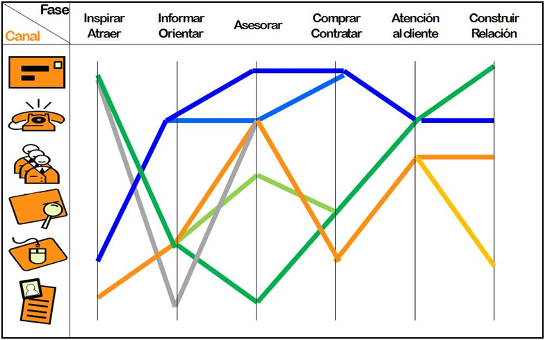 - Analizar qué otros canales usan nuestros clientes y para qué parte del proceso comercial: por ejemplo si usan las redes sociales o el teléfono para informarse; si para comprar usan la web o al equipo comercial, etc. (ver figura 4).