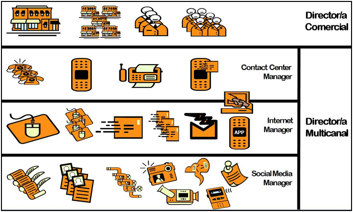 - Pero incluso en organizaciones que disponen de un Director/a Multicanal que agrupa diferentes canales, realmente éste/a no se ocupa de todos los canales, sino, normalmente, de los canales remotos (ver figura 2).
